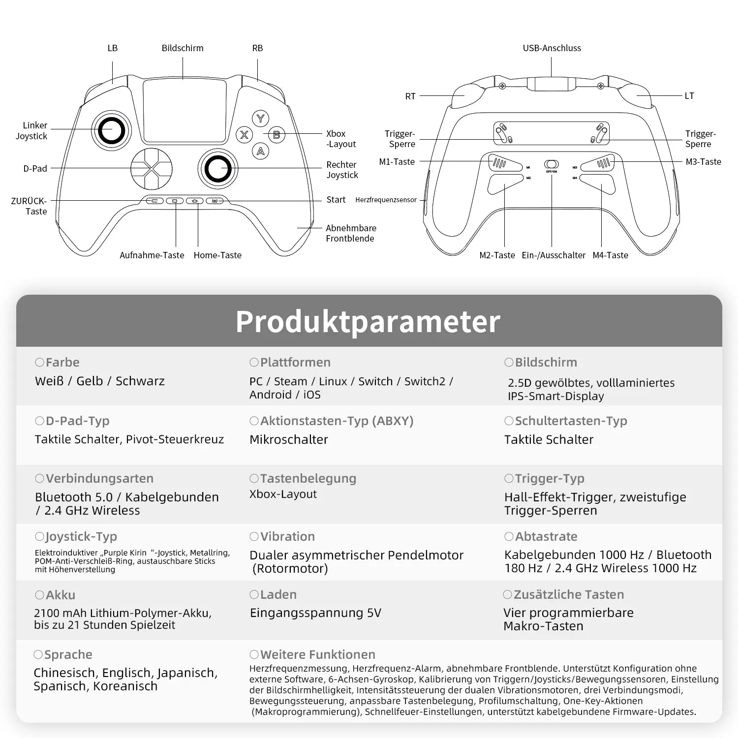 | Weitere Funktionen | Herzfrequenzmessung, Herzfrequenz-Alarm, abnehmbare Frontblende. Unterstützt Konfiguration ohne externe Software, 6-Achsen-Gyroskop, Kalibrierung von Triggern/Joysticks/Bewegungssensoren, Einstellung der Bildschirmhelligkeit, Intensitätssteuerung der dualen Vibrationsmotoren, drei Verbindungsmodi, Bewegungssteuerung, anpassbare Tastenbelegung, Profilumschaltung, One-Key-Aktionen (Makroprogrammierung), Schnellfeuer-Einstellungen, unterstützt kabelgebundene Firmware-Updates. | |||